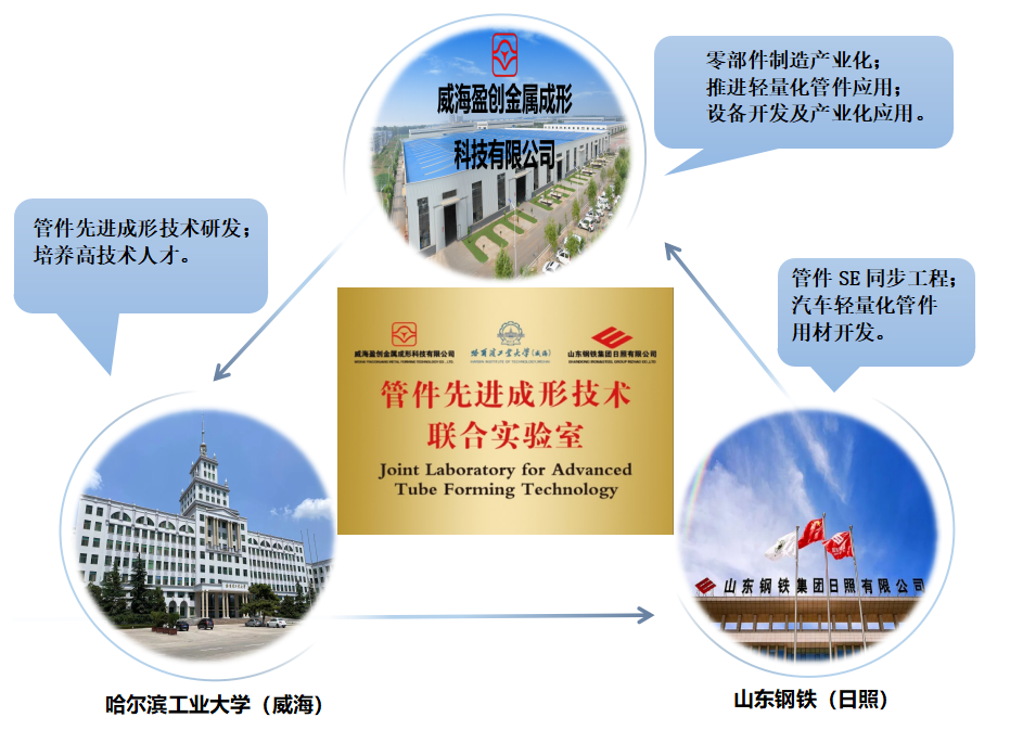 威海盈创金属成形科技有限公司、哈尔滨工业大学(威海)、山东钢铁集团日照有限公司三方共建“管件先进成形技术联合实验室”,构建优势互补、合作共赢的产业链发展平台。提供从用材开发、车身部件优化、成形工艺分析到零部件生产的全链条解决方案,能更快速、更系统的响应客户对汽车轻量化的需求,达到降低碳排放、提高车身安全性的目的。